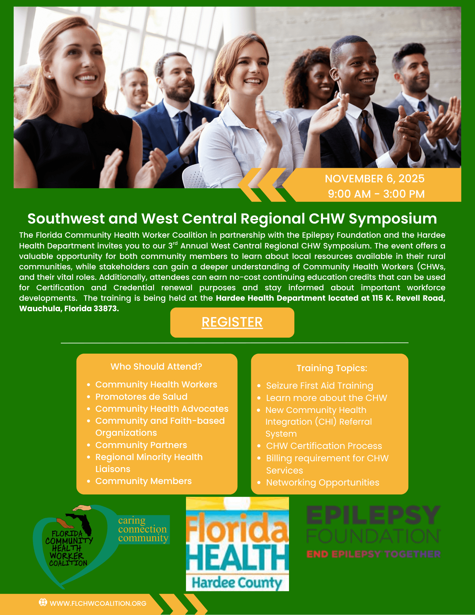 The Florida Community Health Worker Coalition in partnership with the Epilepsy Foundation and the Hardee Health Department invites you to our 3rd Annual West Central Regional CHW Symposium. The event offers a valuable opportunity for both community members to learn about local resources available in their rural communities, while stakeholders can gain a deeper understanding of Community Health Workers (CHWs, and their vital roles. Additionally, attendees can earn no-cost continuing education credits that can be used for Certification and Credential renewal purposes and stay informed about important workforce developments. The training is being held at the Hardee County Health Department located at 115 K. Revell Road Wauchula, Florida 33873.